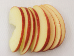 りんごは皮をむいて、4等分にし、芯をカットしてからスライスします。※皮つきで使用する場合はよく洗ってください。
