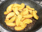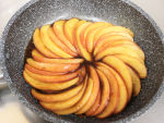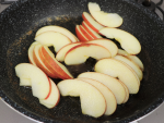 りんごの表面がやわらかくなったら火をとめて、フライパンの底にきれいに並べます。