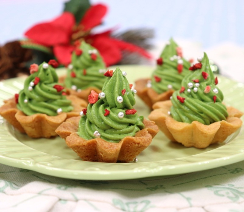 <画像①>クッキーミックスで作った柊の葉と、たて半分にカットしたいちごを、リースのトップに飾り、<画像②>クッキーミックスでお好みで作った可愛いクッキー(写真はジンジャーマン)などをバランス良く飾ります。<画像③>丸く抜いたフルーツをのせ、<画像④>トッピング材料などをデコレーションして仕上げをします。