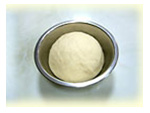 打ち粉(強力粉分量外)を薄く広げた台の上に①の生地を置き、軽く手で押さえてガス抜きをします。綺麗に丸め直し、水で濡らし固く絞った布巾をかけて約10分休ませます。(ベンチタイム)