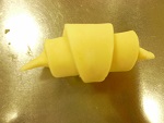 ③の生地をめん棒で二等辺三角形にさらに伸ばし、底辺部分にバター(成形用)を一つのせてクルクル巻き、とじ目をしっかり閉じ、下にします。全部で8個作ります。