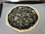 オーブン用シートの上で③の生地を手で丸く広げた後、めん棒で直径約25cm位に2枚とも伸ばします。1枚目の生地をオーブン用シートごと天板の上に乗せ、その上から②の【黒ゴマのフィリング】