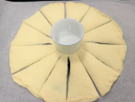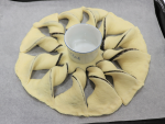 ④の中心部にココット皿を置き、スケッパーで切り込みを12ヶ所入れて12等分にして、1つずつを2回ねじります。ココット皿は取り除きます。※ココット皿は円の中心の目印として置くだけですので、ない場合は使用しなくても大丈夫です。