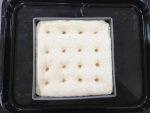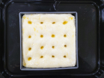 指に強力粉(分量外)をつけ、④の生地全体に等間隔で穴をあけてくぼませ、表面にオリーブオイルをハケでぬります。