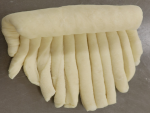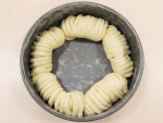 クルクルと巻いて、巻き終わりを下にして型に並べます。※カットしたパン生地がなるべく離れるように巻いたほうが模様がはっきりでます。残りの生地も同様に全部で5つ、型の中心部をあけるように型の側面にそわせて並べます。