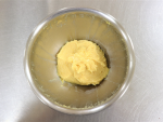 やわらかくしたバターをボウルに入れ、グラニュー糖を加えながらゴムベラで白っぽくなるまでよくすり混ぜます。