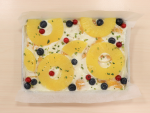 ①にパイナップルとブルーベリー、ミックスナッツを軽く押し込むようにのせ、その上からピスタチオをまぶし、冷凍庫で凍らせます。