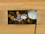 火を止め、【C】と練乳とバニラエッセンスを加えて混ぜます。※40℃位で固まり始めますので長時間放置はお避けください。また、熱すぎると型に流す際に⑥が溶けたり、パウンド型から流れ出てしまう場合がありますのでご注意ください。