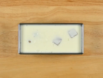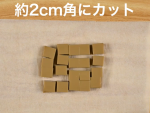 ②と④がそれぞれ固まったら容器から出し、キッチンペーパーで水分をふきます。それぞれ四隅をカットしてから約2㎝角にカットします。