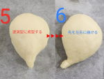 めん棒で丸く伸ばし、上下の生地を合わせてから、左右の生地を合わせます。とじ目をしっかり閉じて下にし、きれいに丸めなおしてから、逆涙型に成型し、おばけのしっぽの部分を左右に曲げます。同様に10個成型します。