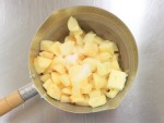 鍋にバター、りんご、レモン汁、グラニュー糖を入れ、強火で焼き色がつくまで炒めたらボウルに移し、粗熱を取ります。