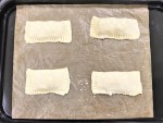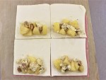 2枚のパイシートをそれぞれ4分割(約9㎝角にカット)し、計8枚にします。パイシートの手前に②とピザ用チーズをのせて折りたたみ、フォークの背でしっかりと閉じます。