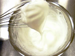 卵白をハンドミキサーの低速でほぐしてから、フワフワになるまで卵白を高速で泡立て、グラニュー糖を2~3回に分けて加え、さらに泡立てます。【メレンゲ】