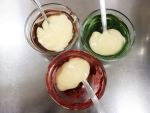 ①のココア生地、抹茶生地、いちご生地に④を大さじ1ずつ入れて混ぜてから、4種類の生地(プレーン、ココア、抹茶、いちご)が均等になるように④を分けます。※プレーン生地は多少多めのほうがきれいに仕上がります。