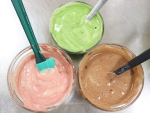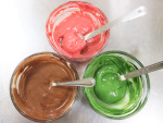 ココアパウダー、抹茶パウダーはそれぞれお湯で溶きます。いちご生地の食用色素 赤は小さな器に入れ、少量のお湯(分量外)で溶かしてから、いちごパウダーとお湯に加え溶かします。