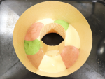 シフォン型に4種類の⑤を大さじ1~2ずつ、なるべく同色が重ならないように分散させながら手早く入れます。170℃に温めたオーブンで約40~50分、竹串をさしてぬれた生地がつかなくなるまで焼きます。