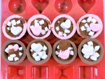 の半数を逆さにしココアパウダーを小さじ1と1/2ずつ入れ、ミニマシュマロを入れます【A】。残りの半数は温めたパレットナイフ等にふちを押し当てて軽く溶かし、【A】に蓋をするように押し付けて接着し冷蔵庫で軽く冷やします。