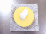 2枚スライス済みのスポンジケーキの1枚の上に③のプレーンのクリームを塗り、もう1枚でサンドします。その上から、プレーンのクリームをナッぺし、クッキングシートを敷いたお弁当箱に入れます。