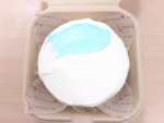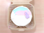 ④の上から③の【水色クリーム】を小さじ1杯乗せてスプーンの背でなでるように広げます。続いてその上から【ピンククリーム】、【紫クリーム】と同様に広げ、何度か繰り返します。