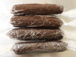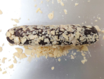 生地を4等分にして直径約2.5cmの棒状にのばしてラップ材に包み(4本分)、約1~2時間冷凍庫で冷やします。 ※焼き上がりは、多少大きくなるので、お好みのサイズより小さめの棒状にしてください。