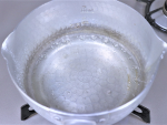 鍋にグラニュー糖と水を入れ、軽く混ぜてから中火で煮詰め、色が付き始めたら弱火にします。