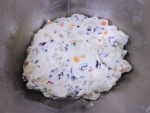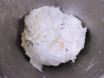 別のボウルに入れた生クリームを泡だてて、七分立てにします。