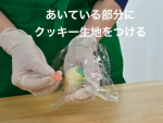 側面のクッキー生地が付いていない部分に、霧吹きをしてからクッキー生地を貼り付けます。