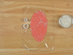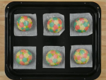 ラップ材の上に直径約10cmの円状になるように、冷凍庫から出したの【クッキー生地】をお好みで配置し、別々のラップ材に全部で6つ作ります。