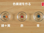 (食用色素赤→赤色) (食用色素青→青色) (食用色素緑+黄→黄緑色)