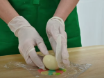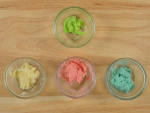 15g(葉用)の生地に食用色素付属のスプーンで色素液(黄緑)1杯、3等分にした生地(お花用)の1つはプレーン生地(ホワイト)にします。残りの2つは、色素液(赤)(青)を各2杯それぞれ入れて混ぜ、ライトグリーン、ピンク、ライトブルー、ホワイトの4色の生地を作ります。(※練りすぎないようにご注意ください。色素の量は目安です。お好みで調整してください。)それぞれラップ材をかけ冷蔵庫で15分休ませます。
