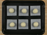 【パン生地】一次発酵後の生地をパンケースから取り出し、6つ(約40~45g/1個)に分割して丸め、霧吹きをしてラップ材をかけ、室温で約10分休ませます。
