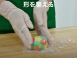 ラップ材をしてパンを潰さないように優しく全体を抑えて形を整え、オーブン用シートにのせます。