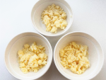 【色素液】をそれぞれの生地にすべて加えてゴムベラで混ぜ、ライトグリーン、ブルー、イエローの3色の生地を作ります。(※練りすぎないようにご注意ください。色素の量は目安です。お好みで調整してください。)それぞれラップ材をかけ冷蔵庫で15分休ませます。