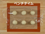 ①の【パン生地】一次発酵後の生地をパンケースから取り出し、6つ(約40~45g/1個)に分割して丸め、霧吹きをしてラップ材をかけ、室温で約10分休ませます。