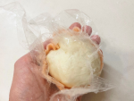 ラップ材をしてパンを潰さないように優しく全体を抑えて形を整え、オーブン用シートにのせます。