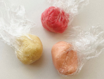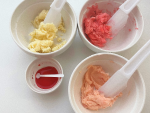 ②のクッキー生地を3等分にし、食用色素付属のスプーンで色素液(赤)を1杯入れて混ぜてピンクにし、もう1つの生地に残りの色素液をすべて入れレッドの生地を作ります。残りの生地はプレーン生地(ホワイト)にします。(※練りすぎないようにご注意ください。色素の量は目安です。お好みで調整してください。)