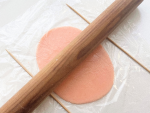 それぞれの生地をさらに2つに分けて合計6コにします。ラップ材の間に挟み、両脇に竹串を置いてめん棒で平らに伸ばします。(生地が均等な厚さになります)