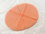 中心で交差するようにスケッパー(またはカード)で大きく×(バツ)跡(写真:赤の点線部分)をつけ、ハートの割れ目のところに、スケッパーで縦(写真:赤の点線部分)に線を入れます。
