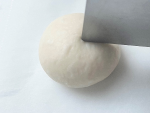 表面がきれいになるように再度丸めなおしてとじ目を下にし、ハートの谷間になるところを、スケッパーでカットを入れます。