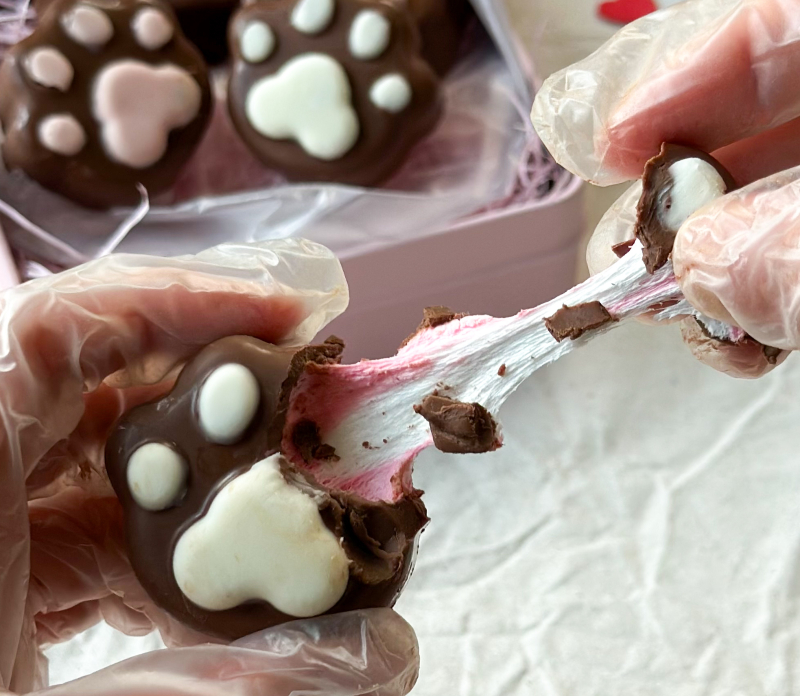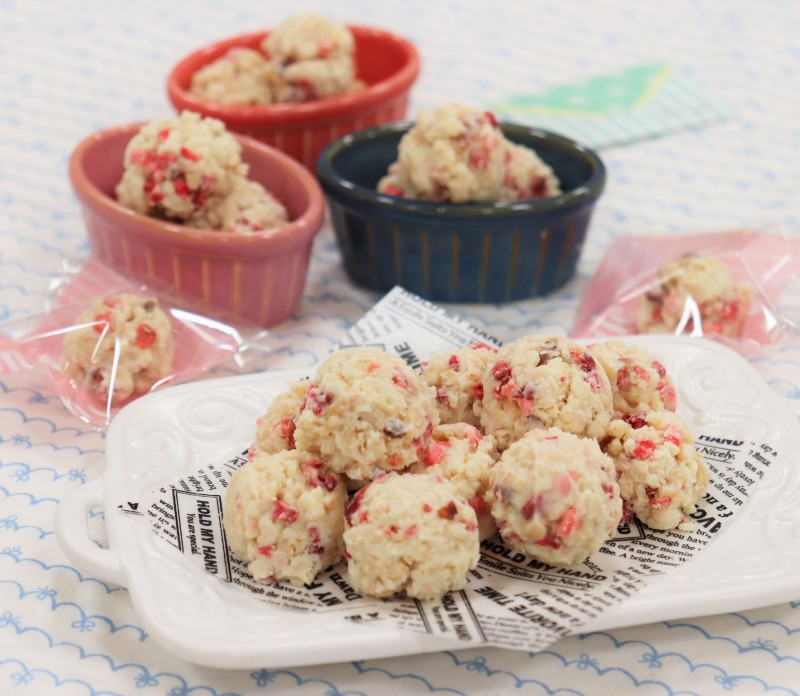 フリーズドライいちご以外でホワイトコーチングに色を付けたい場合、工程③で溶かしたホワイトコーチングを作りたい色の数だけボウル(小)に分け、抹茶パウダーや食用色素を少しずつ混ぜて色味を調整してお好きなアニマルを作ってみてください。(例: 青色のホワイトコーチングを作りたい場合は食用色素 青をごく少量を少しずつ加えてよく混ぜて色味を調整します。)