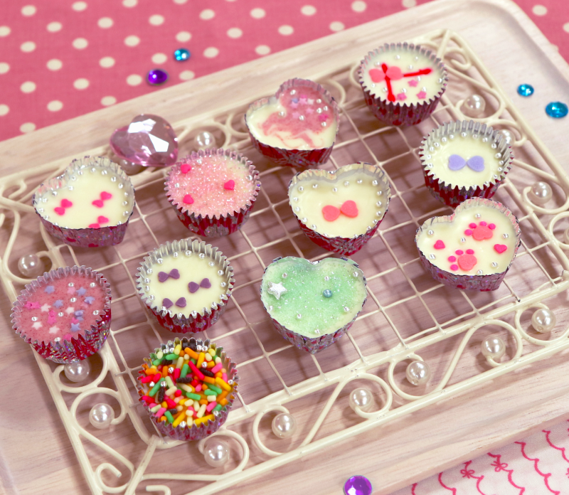 ④のチョコが固まる前にトッピングミックスでデコレーションしたら、冷蔵庫で30分冷やします。