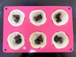 オーブンを200℃に設定し予熱をする間に、プルーンをナイフで4等分にし、1つのタルトに2つずつ入れてを流し入れます。