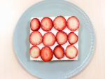 スライスしたいちごを形に沿ってのせてクリームを全体に塗り、もう1枚のスポンジをのせます。