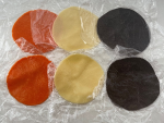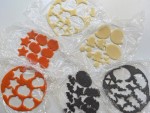 ⑨のパーツを直径10cmの円に収まるように、ラップ材の上に隙間を開けずに詰めて並べます。これを2枚と、⑩のジャックオランタン1枚、お化け1枚、黒猫1枚で合計5枚用意します。