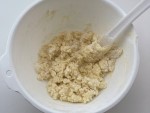 室温に戻したバター(食塩不使用)をゴムベラでよく練り、粉糖を加え混ぜ合わせます。牛乳を少しずつ入れてその都度混ぜ、薄力粉とアーモンドプードルをあわせてから2回にわけてふるい入れ、切るように混ぜ、そぼろ状にします。