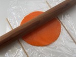 生地をラップ材の間に挟み、両脇に竹串を置いてめん棒で平らに伸ばします(直径約11cm)。各色2枚ずつ、計6枚作ります。(竹串を置くことで生地が均等な厚さになります)
