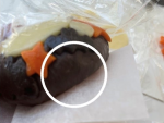 パン生地側面のクッキー生地が付いていない部分(画像の〇枠部分)に、霧吹きをしてから残っているクッキー生地のパーツを貼り付けて、出来るだけ隙間を埋めます。
