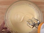 別のボウルに卵と砂糖を入れ、湯せん(約60℃)で温めながら、泡立て器(あればハンドミキサー)で白っぽくもったりとするまで泡立て、バニラオイルを加えます。
