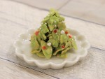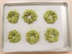 ③を大さじ1程用意しておいたバットにのせ、中心をあけてリース状に形を整えます。同様に6個作ります。固まる前に、①のリボンとアラザン、フリーズドライイチゴをのせ冷蔵庫で冷やし固めます。