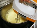 別のボウル大に卵とグラニュー糖を入れ、湯せん(約60℃)にかけながらハンドミキサーで泡立てます。生地が40℃(人肌程度)に温まったら湯せんからはずし、もったり するまでしっかり泡立てます(共立て) 。生地の量が3倍位になり、生地を上からたらすとゆっくりと落ち、跡が残る程度まで泡立てます。